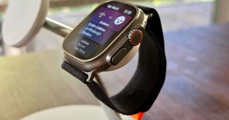 Image en vedette : Apple Watch Ultra avec Trail Loop utilisant le cadran de la montre Siri sur Belkin BoostCharge Pro