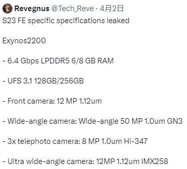 Samsung est connu pour avoir sorti une version Fan Edition (FE) de ses téléphones phares, et le Galaxy S23 FE ne fait pas exception. Bien qu’il y ait encore très peu de retours sur le téléphone, un récent message Twitter de @Tech_Reve en révèle plus sur cet appareil. Le plus important est que cet appareil utilisera la propre puce Exynos 2200 de Samsung. De plus, il n’y aura pas de version Snapdragon. Selon SamMyFans, Samsung a choisi le SoC Exynos 2200 pour réduire les coûts et maintenir les bénéfices.