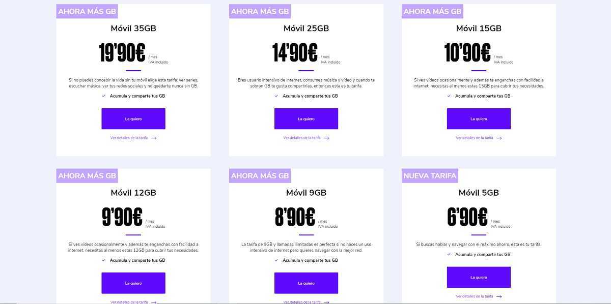 Les utilisateurs peuvent obtenez jusqu’à 5 Go de plus de cette façon pour naviguer dans le cas du tarif le plus cher, par exemple. Cette augmentation en gigaoctets représente une grande amélioration de tous les tarifs de l’opérateur, qui maintiennent toutes leurs conditions, comme nous l’avons mentionné. N’oubliez pas qu’ils utilisent la couverture Vodafone, également en Europe, afin que vous ayez toujours une bonne réception.