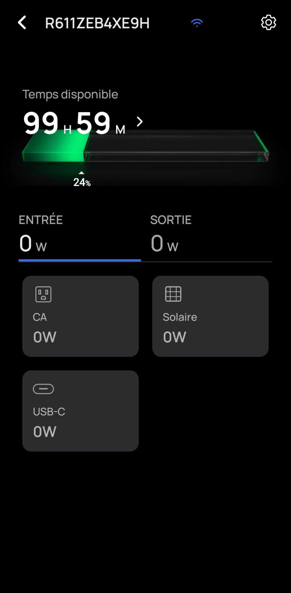 Une fois la batterie connectée, nous arrivons sur un tableau de bord qui permet de visualiser toutes les tensions d’entrée et de sortie en cours, ainsi que de pouvoir désactiver directement les lots de prises branchées. Je préférais le design de la précédente version de l’app, aux couleurs de la marque sur tous les tableaux, remplacé ici par un noir adapté aux écrans OLED mais offrant davantage de lisibilité.