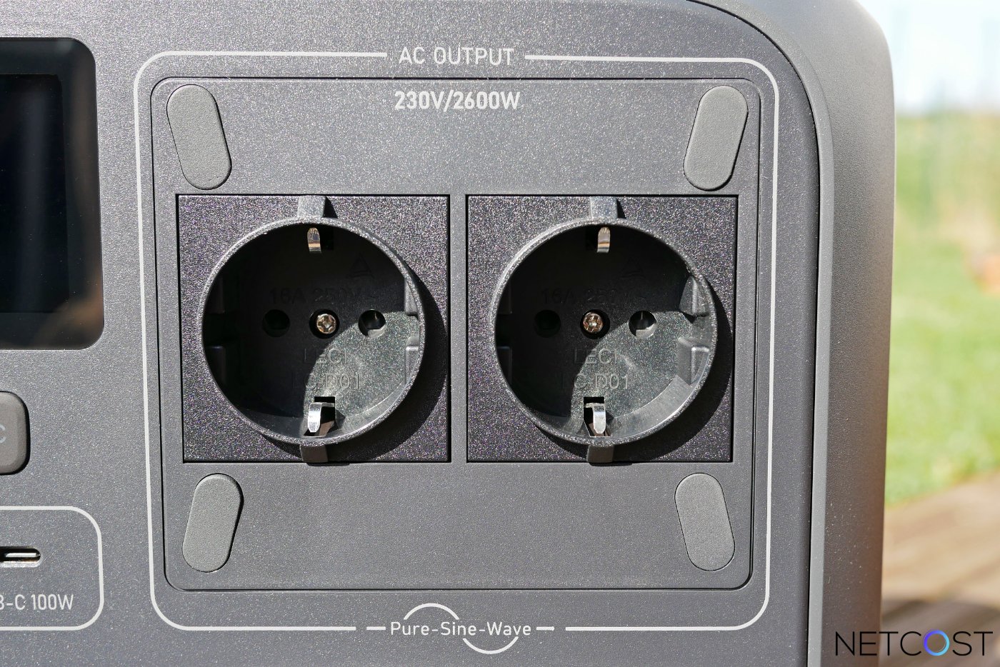 À droite de cet écran, deux prises CA 230 V de type E/F sont présente, assurant une alimentation continue allant jusqu’à 2600 W.
