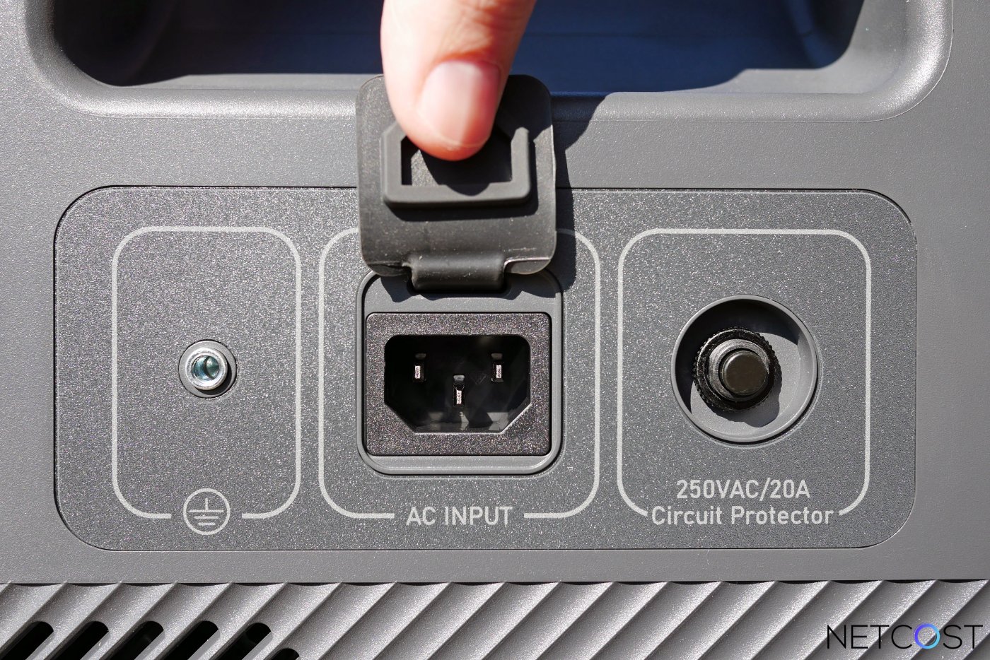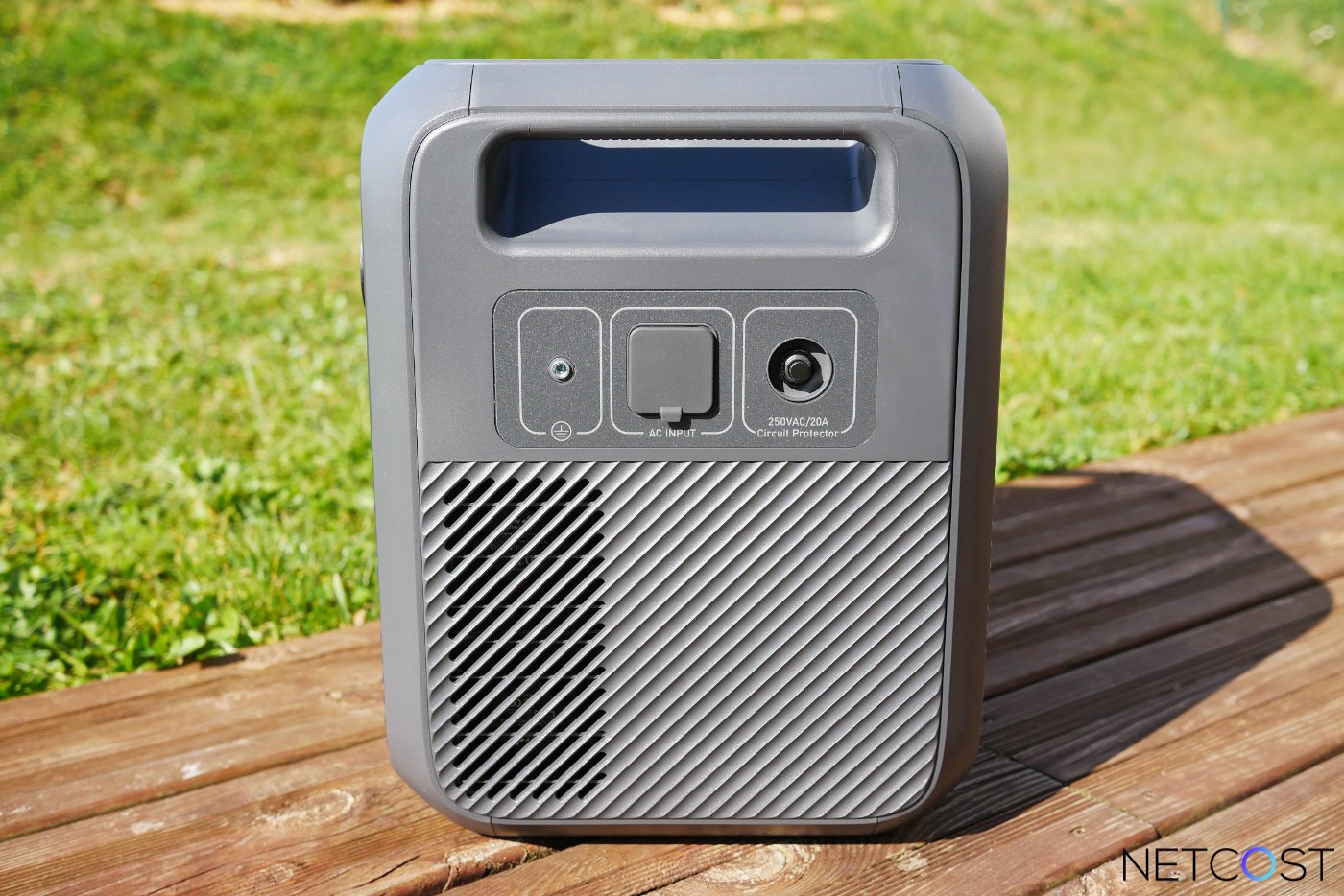 Sur le côté droit de la batterie une entrée secteur est présente, elle compatible avec un câble CEE 7/4 (fourni) pour une recharge à 2300 W. Un port de mise à la terre est également présent, garantissant une alimentation sécurisée pour des équipements sensibles.