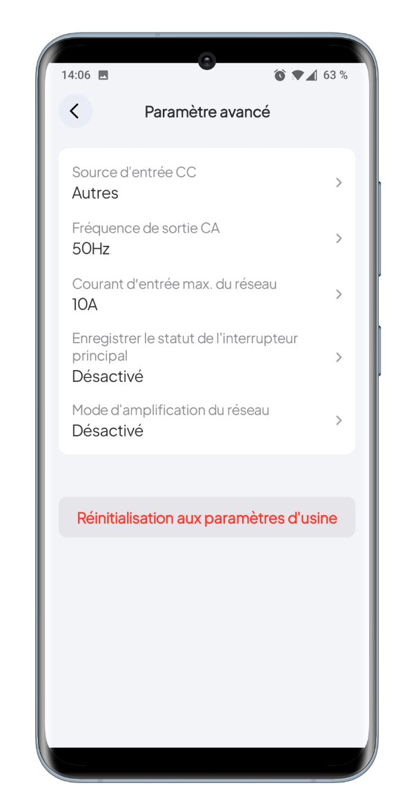 L’application propose également un accès aux paramètres avancés de la batterie. Il est possible d’ajuster la source d’entrée CC, la fréquence de sortie CA (50 Hz par défaut) et de limiter le courant d’entrée maximal du réseau (10 A). Deux options supplémentaires sont disponibles : l’enregistrement du statut de l’interrupteur principal et l’activation du mode d’amplification du réseau, toutes deux désactivées par défaut. En cas de besoin, une réinitialisation aux paramètres d’usine est accessible via un bouton dédié.