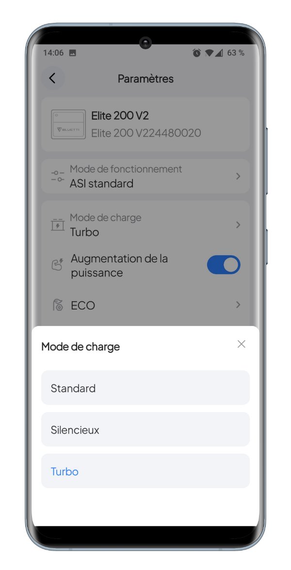 Les paramètres sont bien organisés. Vous pouvez choisir entre trois modes de charge, activer le mode « Power Lifting » pour gérer les surtensions.
