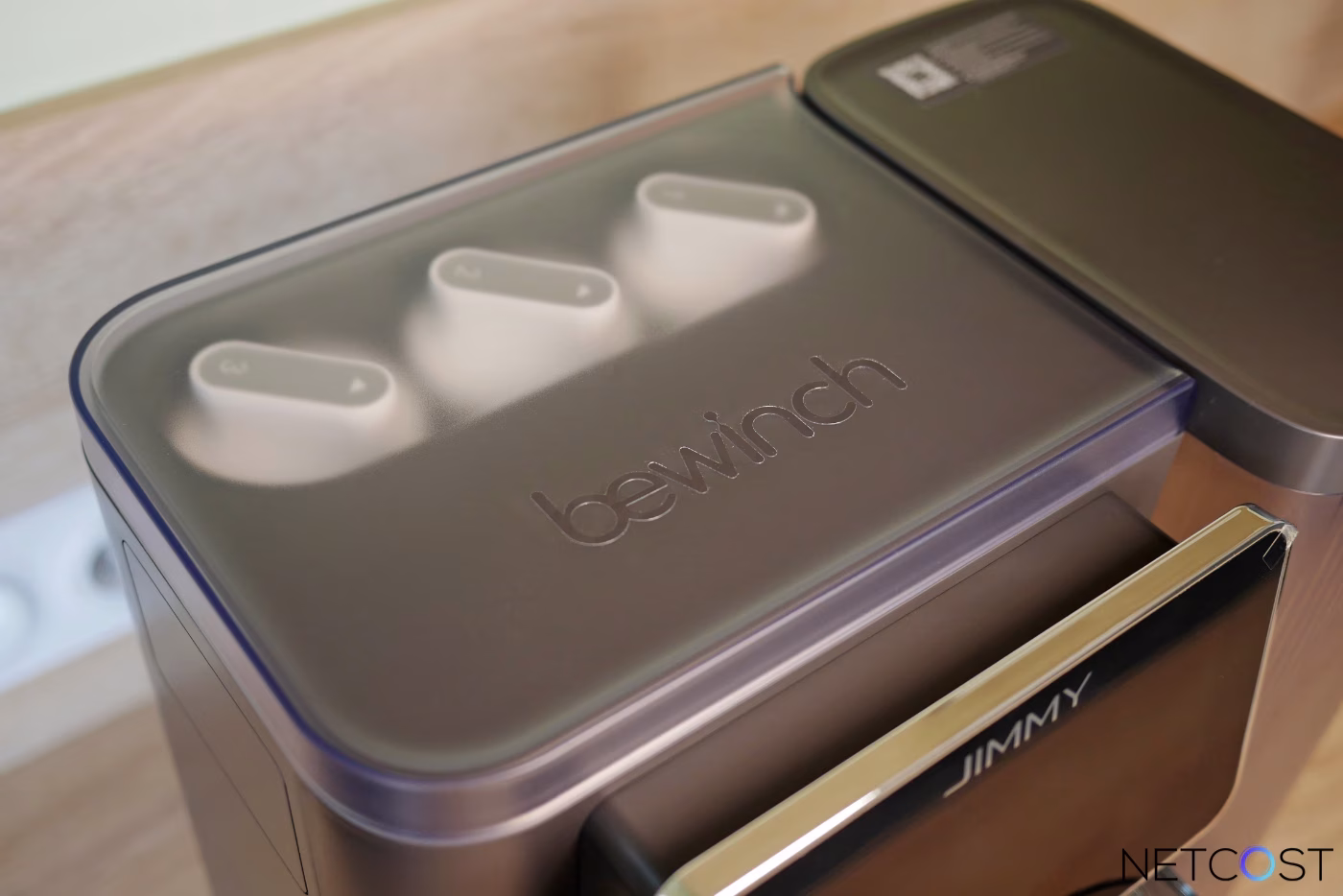 Ces réservoirs extérieurs transparents créent un joli contraste avec le boîtier opaque tout en permettant un contrôle visuel permanent des niveaux. Leurs poignées moulées préservent l’unité esthétique sans compromettre la praticité. Jimmy a prévu un système d’accroche simple qui maintient fermement les bacs en position, et on apprécie la possibilité de les ranger au réfrigérateur.
