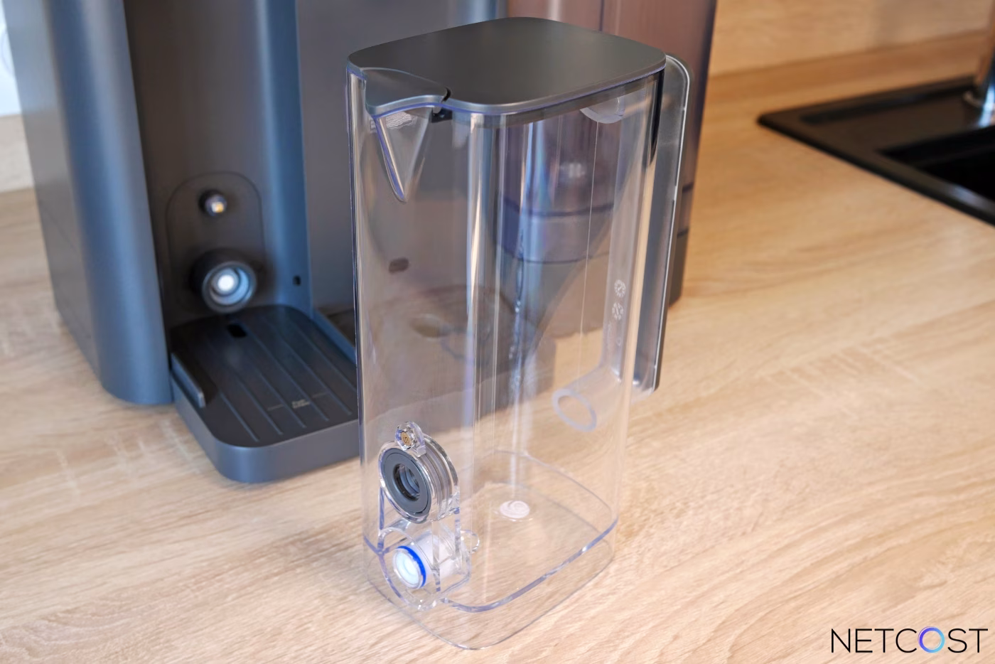 Le bac récupérateur d’eau fait son travail discrètement. Ce petit plateau se clipse et se déclipse d’un geste pour récupérer les quelques gouttes qui s’échappent parfois quand on retire une tasse trop rapidement. Sa finition mate s’accorde parfaitement avec l’ensemble, et sa forme épouse le contour du bec verseur pour éviter les flaques sur le plan de travail.