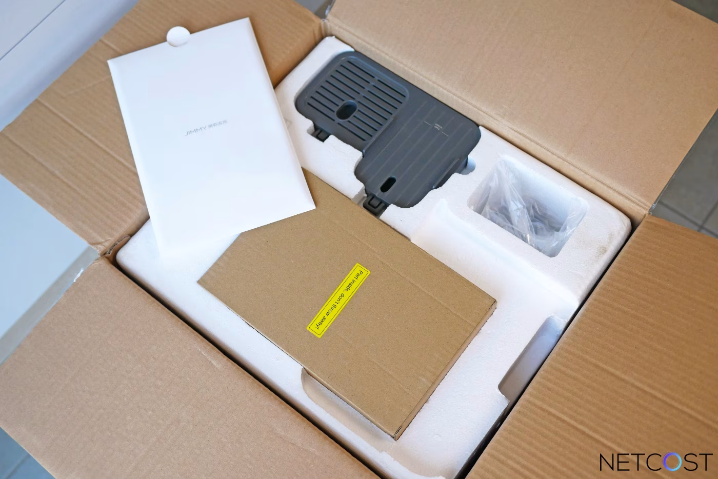 Jimmy a soigné la présentation de son R9 avec un carton robuste et un conditionnement en polystyrène moulé qui maintient parfaitement chaque élément en place. À l’ouverture, on découvre le purificateur avec ses filtres déjà préinstallés, ce qui évite les manipulations lors du premier démarrage. L’appareil arrive prêt à fonctionner, il suffira juste de laisser les pièces à l’air libre pendant 8 à 12 heures puis de rincer les bacs.