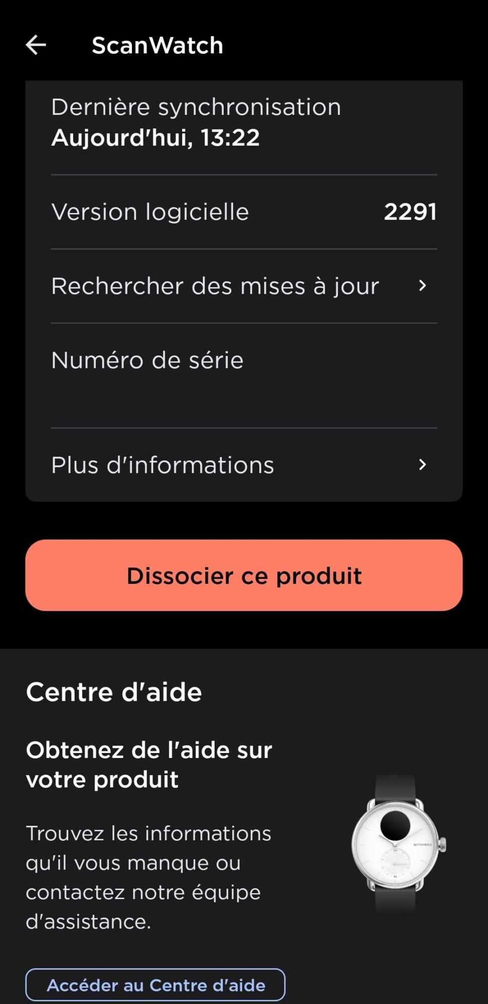 Vous retrouverez dans les captures ci-dessous tous les réglages permis sur la montre, regroupé en 4 sections « Général, « Option d’affichage », Fonctionnalités santé » et « Entraînement ». Vous aurez également accès à quelques informations sur la ScanWatch et la possibilité de la mettre à jour dans la dernière partie :