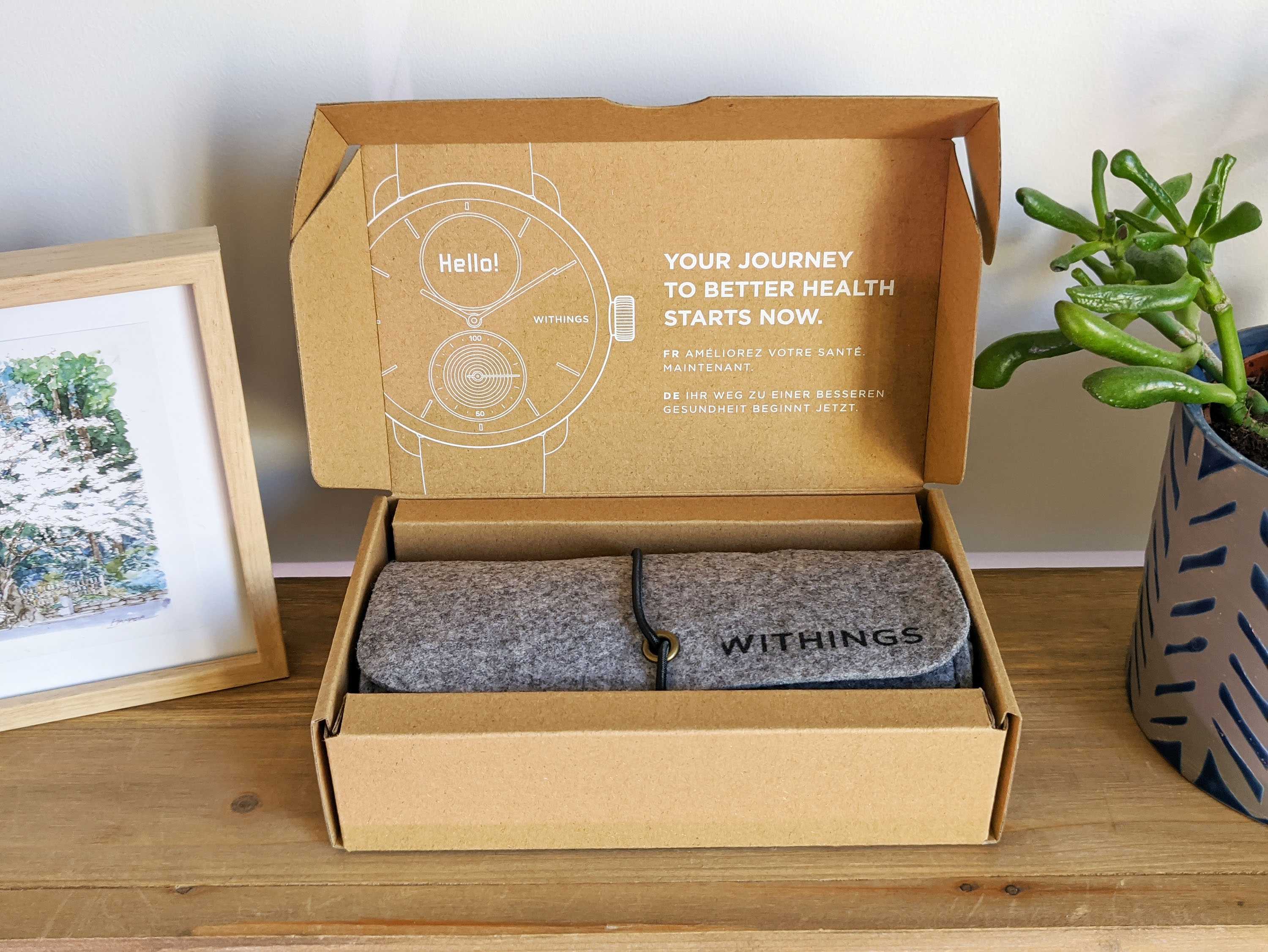 La montre ScanWatch de Withings arrive dans une petite boite mettant en avant le produit ainsi que ses principales fonctionnalités ainsi que les systèmes et appareils compatibles.